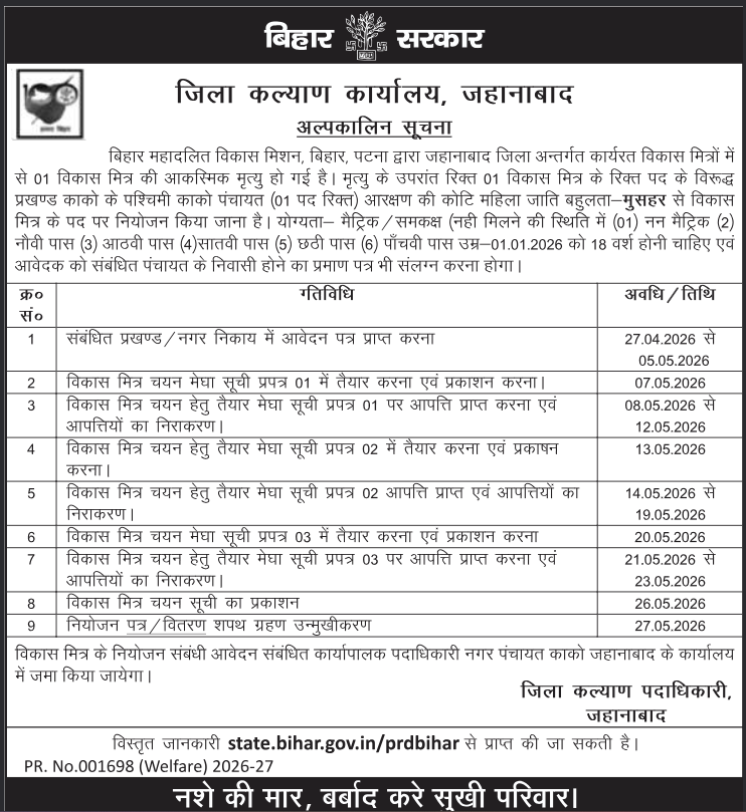 Short Information : बिहार विकास मित्र भर्ती 2026 बिहार महादलित विकास मिशन, बिहार सरकार के तहत जिला कल्याण कार्यालय, जहानाबाद द्वारा विकास मित्र भर्ती 2026 के लिए नई सूचना जारी की गई है। जहानाबाद जिले के संबंधित पंचायत क्षेत्र में विकास मित्र के 01 रिक्त पदो पर भर्ती होने वाली है। ऑनलाइन आवेदन शुरू प्रकिरया तिथि 27 अप्रैल 2026 से उमीदवार 05 मई 2026 तक आवेदन कर सकते है | आयु सीमा (01 जनवरी 2026 के अनुसार) से 18 वर्ष अधिकतम आयु नियमानुसार होनी चाहिए| यह भर्ती स्थानीय पंचायत स्तर पर की जाएगी। अधिकारी वैबसाइट state.bihar.gov.in/prdbihar आवेदन ऑफलाइन होगा|