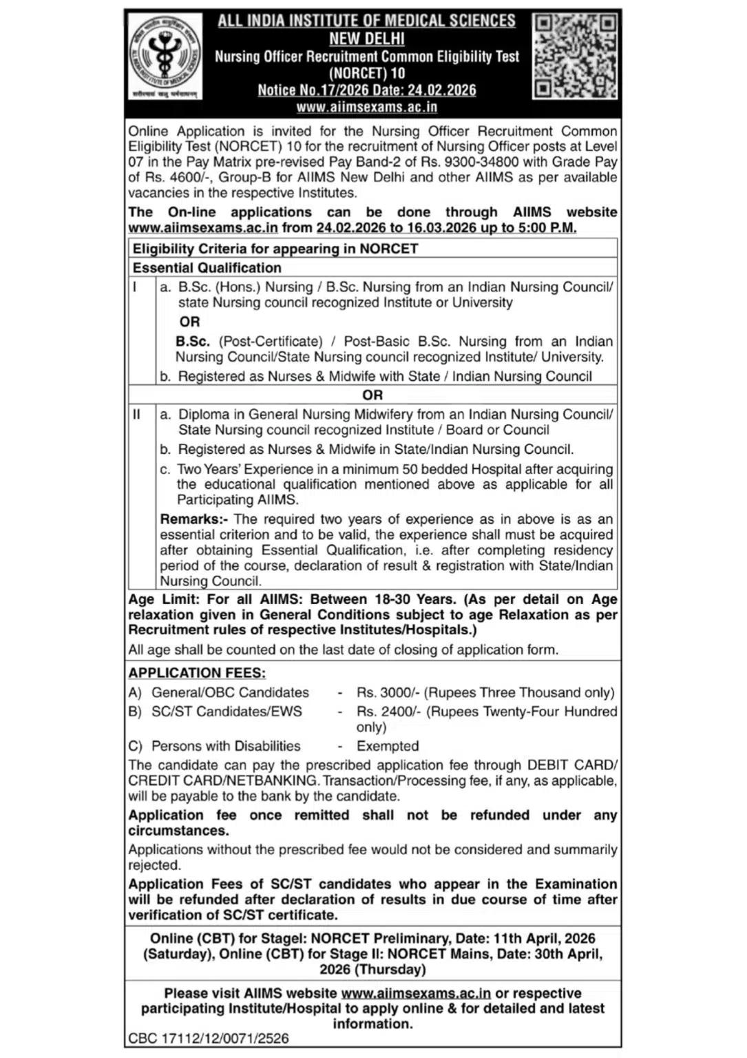 Short Information : AIIMS NORCET 10th Nursing Officer Vacancy 2026 The All India Institute of Medical Sciences (AIIMS), New Delhi, has released a notification on its official website for the recruitment of Nursing Officers for the 10th Phase of NORCET. This recruitment process is for over 3,000 positions. The AIIMS application form began on February 24, 2026, and candidates can apply until March 16, 2026. Candidates must be at least 18 years of age and at most 30 years of age as of March 16, 2026. Candidates can find the direct application link for the AIIMS NORCET 10th Phase Nursing Officer Recruitment 2026 below. Please read the notification before applying (Advt. No. 17/2026).