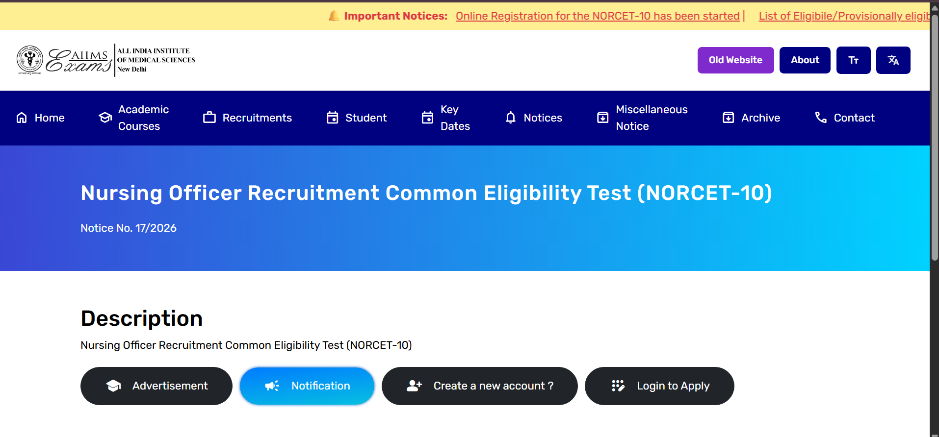AIIMS NORCET 10th Nursing Officer Vacancy 2026 Important Apply Online Link