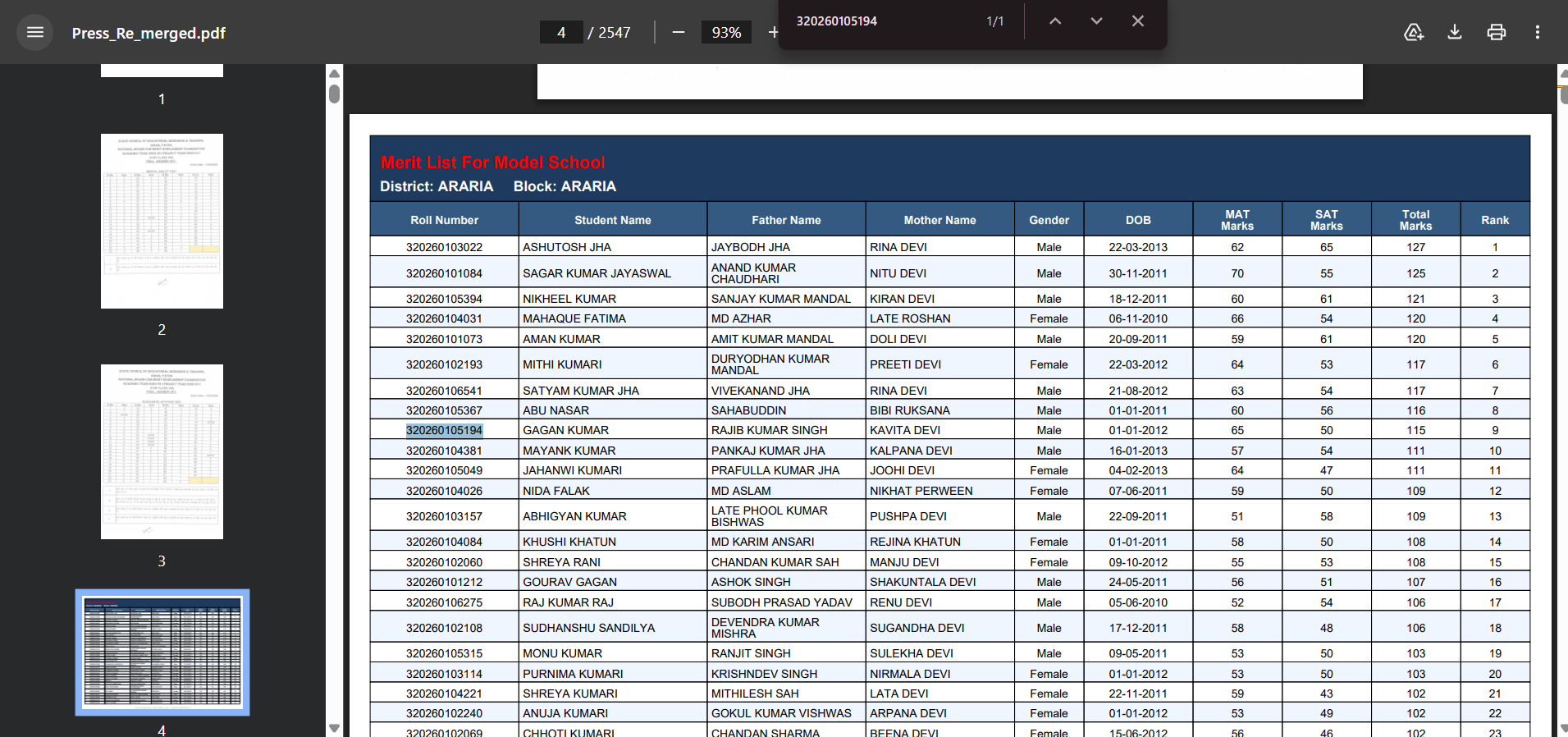 Use Ctrl + F (search) to find your Name or Roll Number