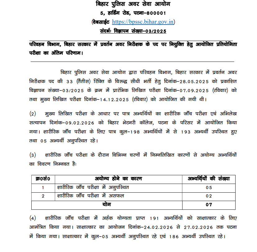 Short Information : Bihar Police Enforcement SI Final Result 2026 Bihar Police Subordinate Service Commission (BPSSC) has released the final result for the post of Bihar Police Enforcement Sub Inspector in the Transport Department. Final result release date is March 10, 2026. This recruitment was released for 33 posts. Applications for Bihar Police BPSSC SI Enforcement SI Recruitment 2025 were accepted from May 30, 2025 to June 30, 2025. The interview exam was held from February 24 to 27, 2026. Candidates who appeared in the Mains exam can check their BPSSC Bihar Police Enforcement SI Final Result 2026 by visiting the direct result link given below. Official Update IndianSarkari2026