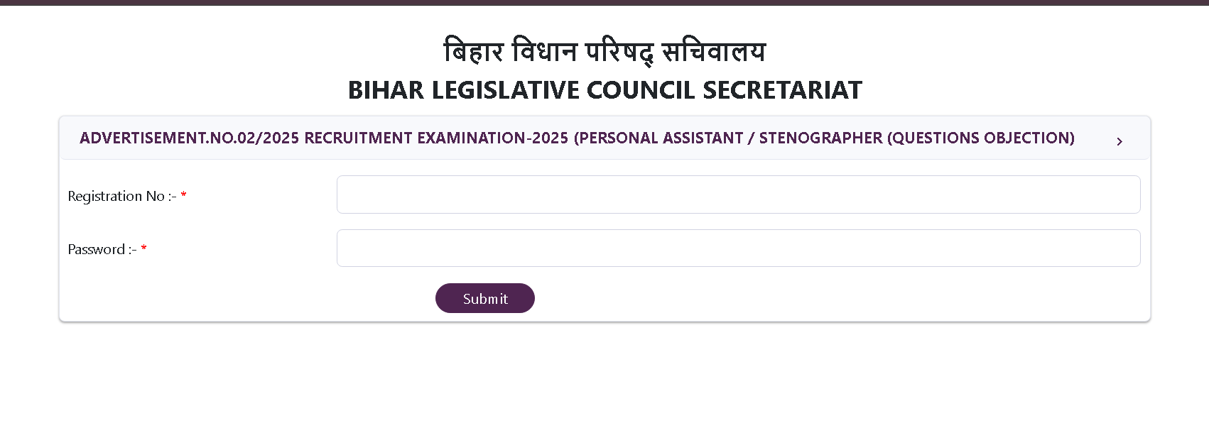 A: If you have forgotten your registration number, first check your registered email inbox and SMS inbox. The Bihar Vidhan Parishad sends confirmation details at the time of application and admit card issuance. You can also refer to any saved printouts of your application form or admit card. The login portal may have a “Forgot Registration Number” link to help you recover your credentials.