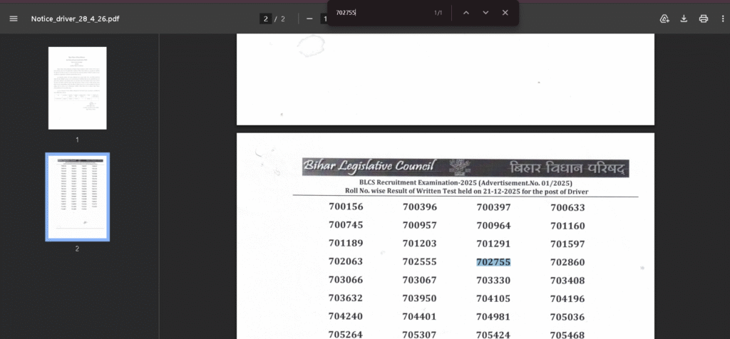 Short Information : Bihar Vidhan Parishad Driver Pre Result 2026 The Bihar Legislative Council has released the preliminary results for the Driver and Office Attendant Examination 2025. The results were published on its official website, biharvidhanparishad.gov.in, on April 29, 2026. This examination was conducted on December 21, 2025. The application process for the Bihar Legislative Council recruitment commenced on September 29, 2025, and candidates were able to submit their applications until October 20, 2025. Candidates must navigate to the ‘Results’ section on the portal and click on the ‘Bihar Legislative Council Driver Result’ link. A PDF file will open; candidates can then press the ‘CTRL+F’ keys and enter their Roll Number to view their preliminary result.