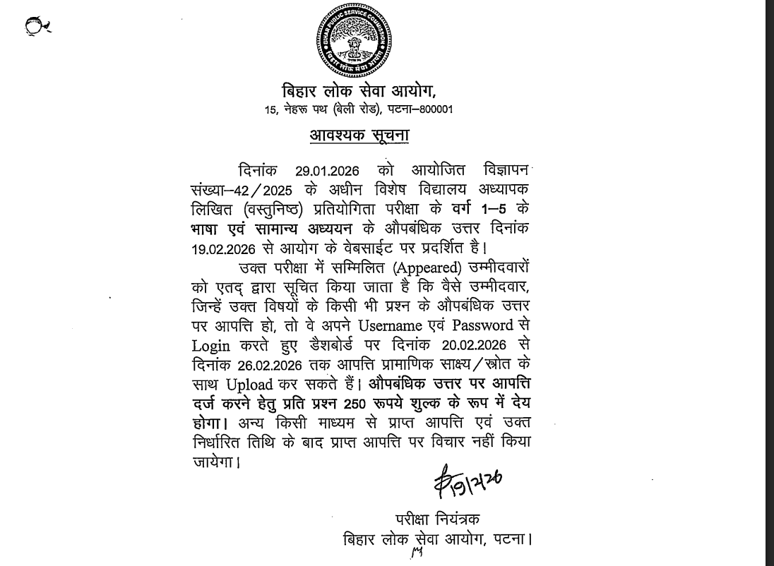 Answer: The answer key was released on 19 February 2026 on the official website of Bihar Public Service Commission.