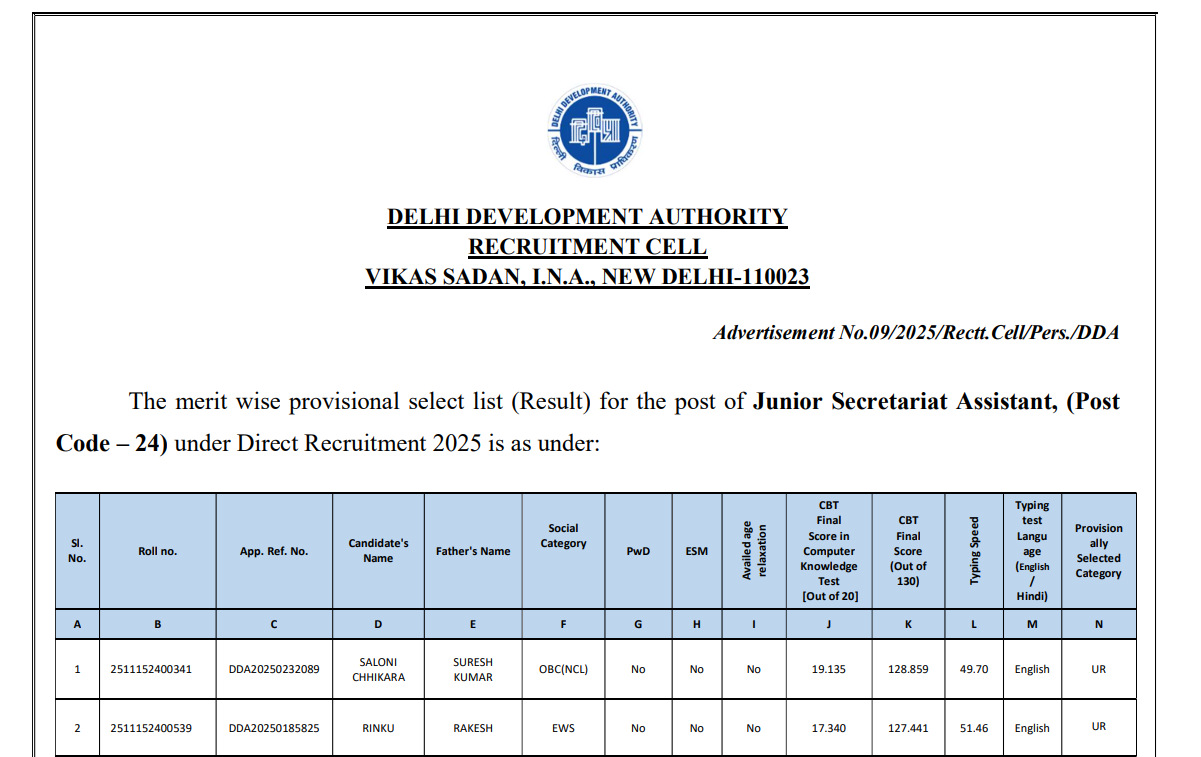 Delhi Development Authority (DDA)Delhi DDA JSA Final Result 2026 |
