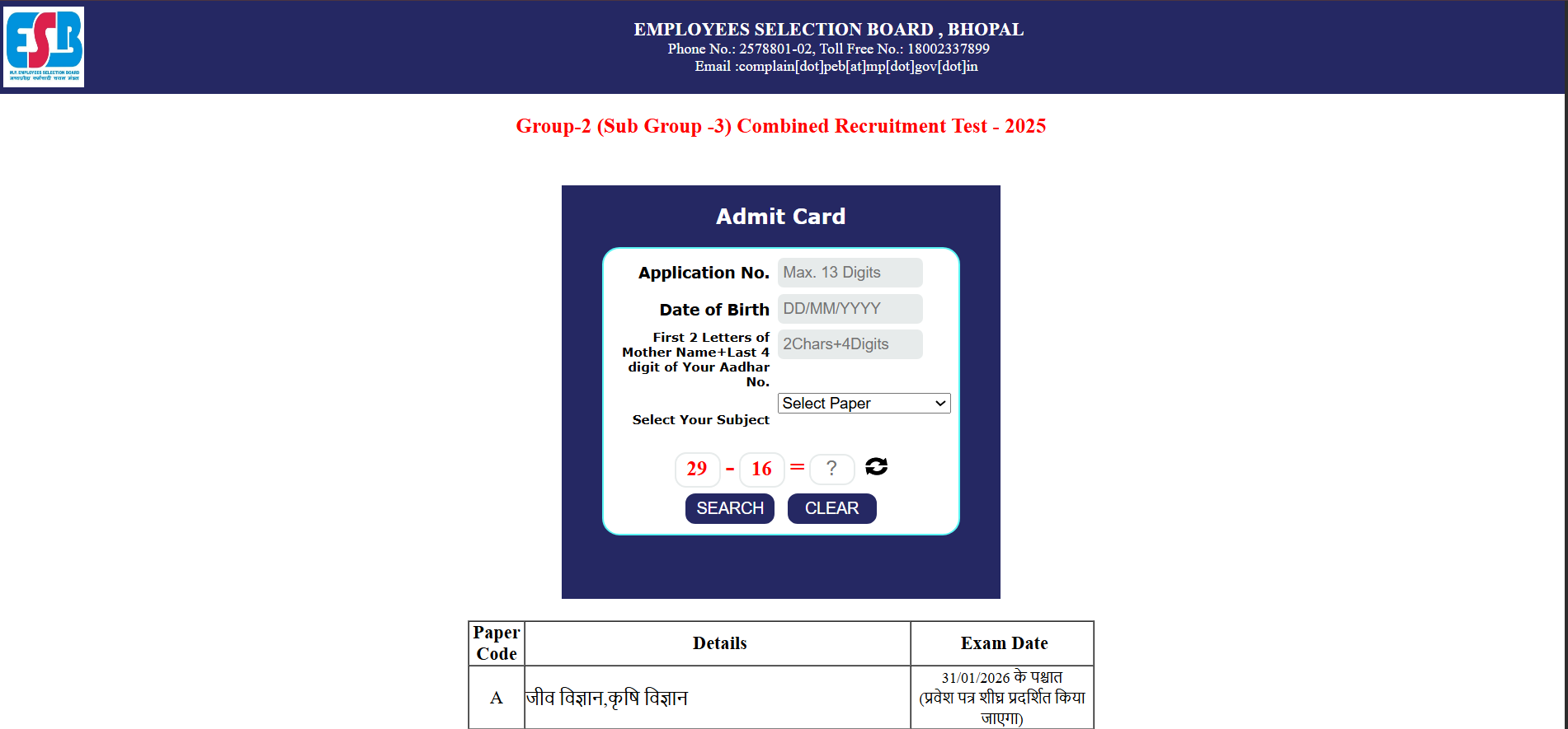Short Information : MPESB Group 2 Sub Group 3 Admit Card 2026 The Madhya Pradesh Employee Selection Board (MPESB) has released the admit cards for the Junior Engineer and other Group 2 Sub Group 3 posts on its official website. The exam will be held on January 28, 2026, and the last date for submitting application forms was November 12, 2025. Candidates can also check all the details related to the exam date/admit card on the official IndianSarkari2026 portal by logging in with their registration number or date of birth. The direct link is provided below.