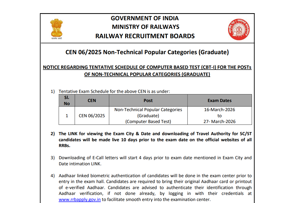 Short Information : RRB NTPC Graduate Level CBT I Exam Date 2026 Railway Recruitment Board (RRB) has released the CBT-I exam date for Non-Technical Popular Category (NTPC) Graduate Level Posts recruitment on the official website. The exam will be held from 16 March 2026 to 27 March 2026, and the last date for submission of application form was 27 November 2025. Candidates can soon download their exam city details/admit card by logging in to the portal using their enrollment number, registration number, or date of birth. (Advt No : CEN 06/2025) All official updates can be found on IndianSarkari2026.