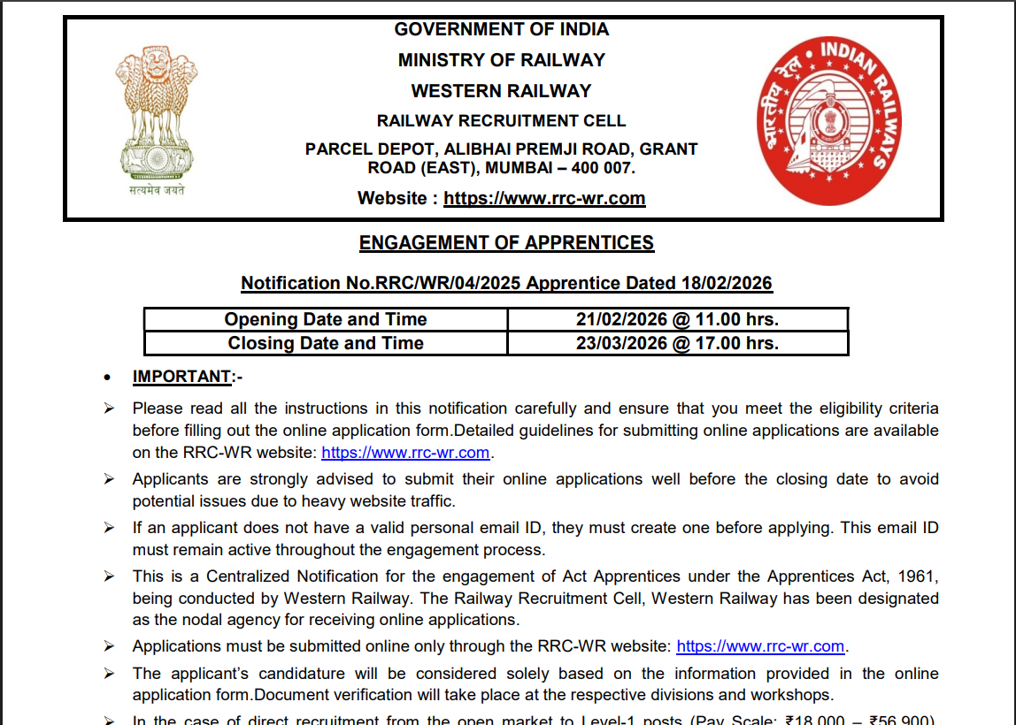 - Candidates must read the notification before filling the RRC WR Apprentice Recruitment 2026 online application form.