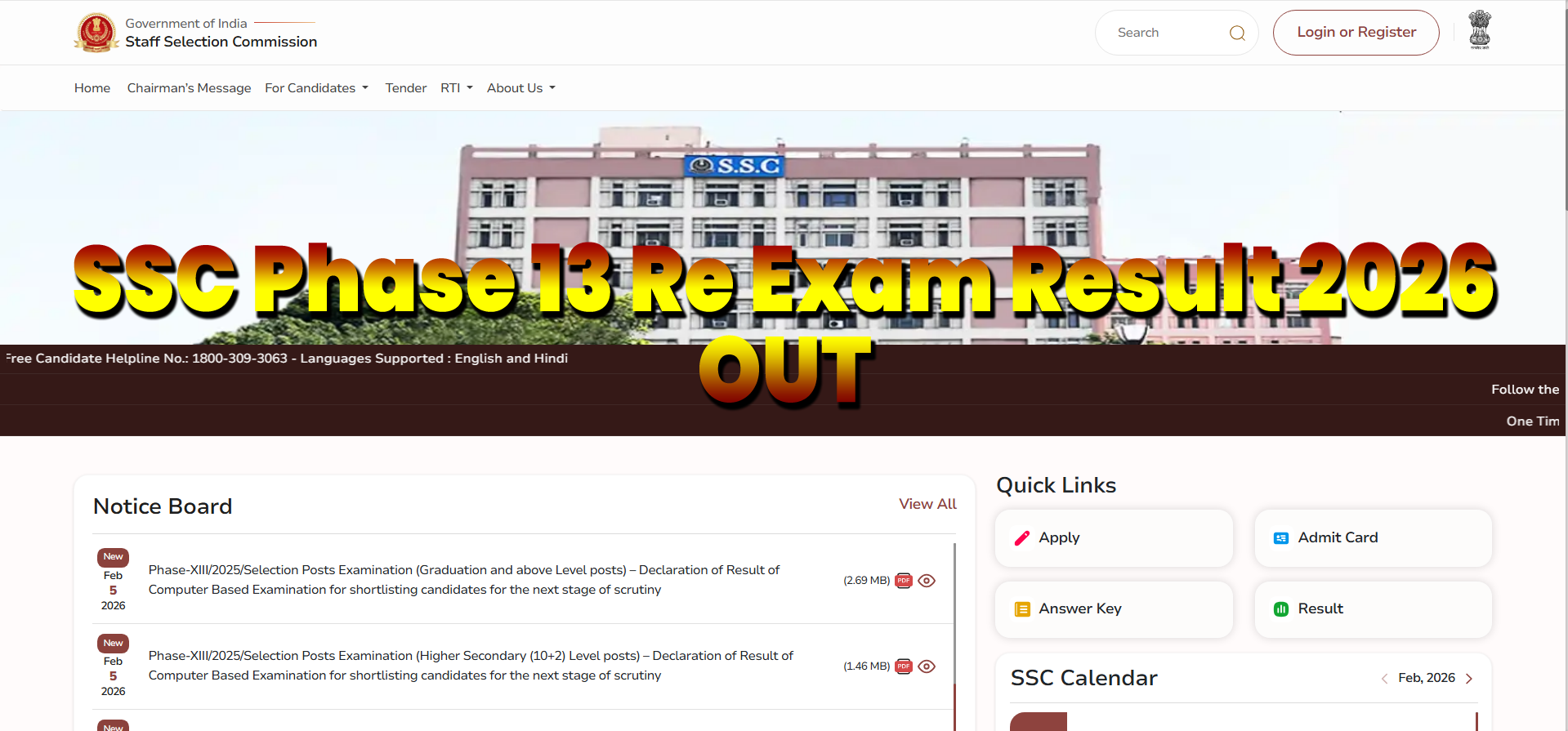 Short Information : SSC Phase 13 Re Exam Result 2026 The Staff Selection Commission (SSC) has released the results of the recruitment examination for various Selection Posts Phase-13 2025 on its official website. The examination was held on August 29, 2025, and the last date for submitting application forms was June 23, 2025. Candidates can check their results by logging into the portal using their enrollment number, registration number, or date of birth. The official update and direct link from IndianSarkari2026 are provided below. (Advertisement Number Phase XIII/2025)
