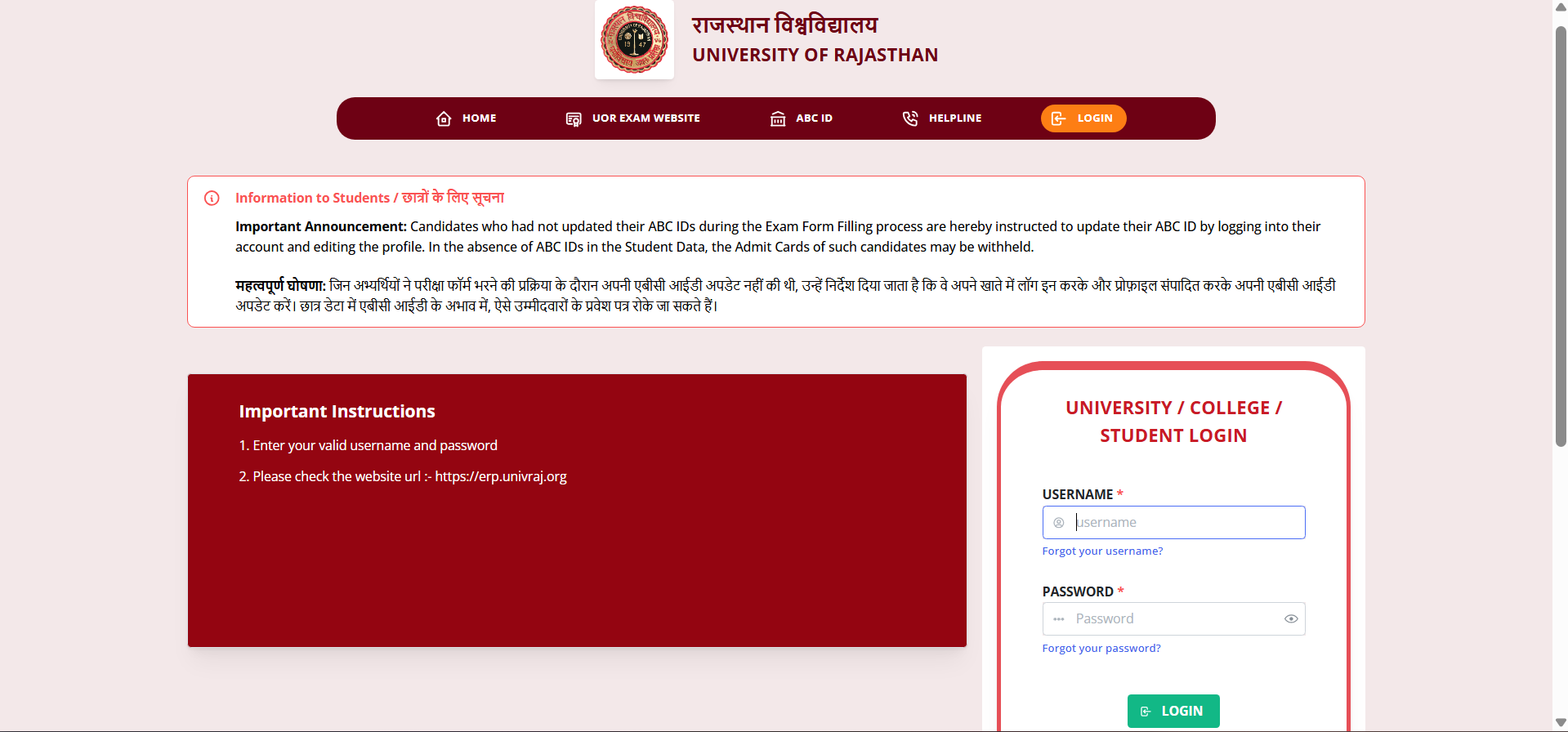 - Open the official portal of the University of Rajasthan, i.e. https://erp.univraj.org.