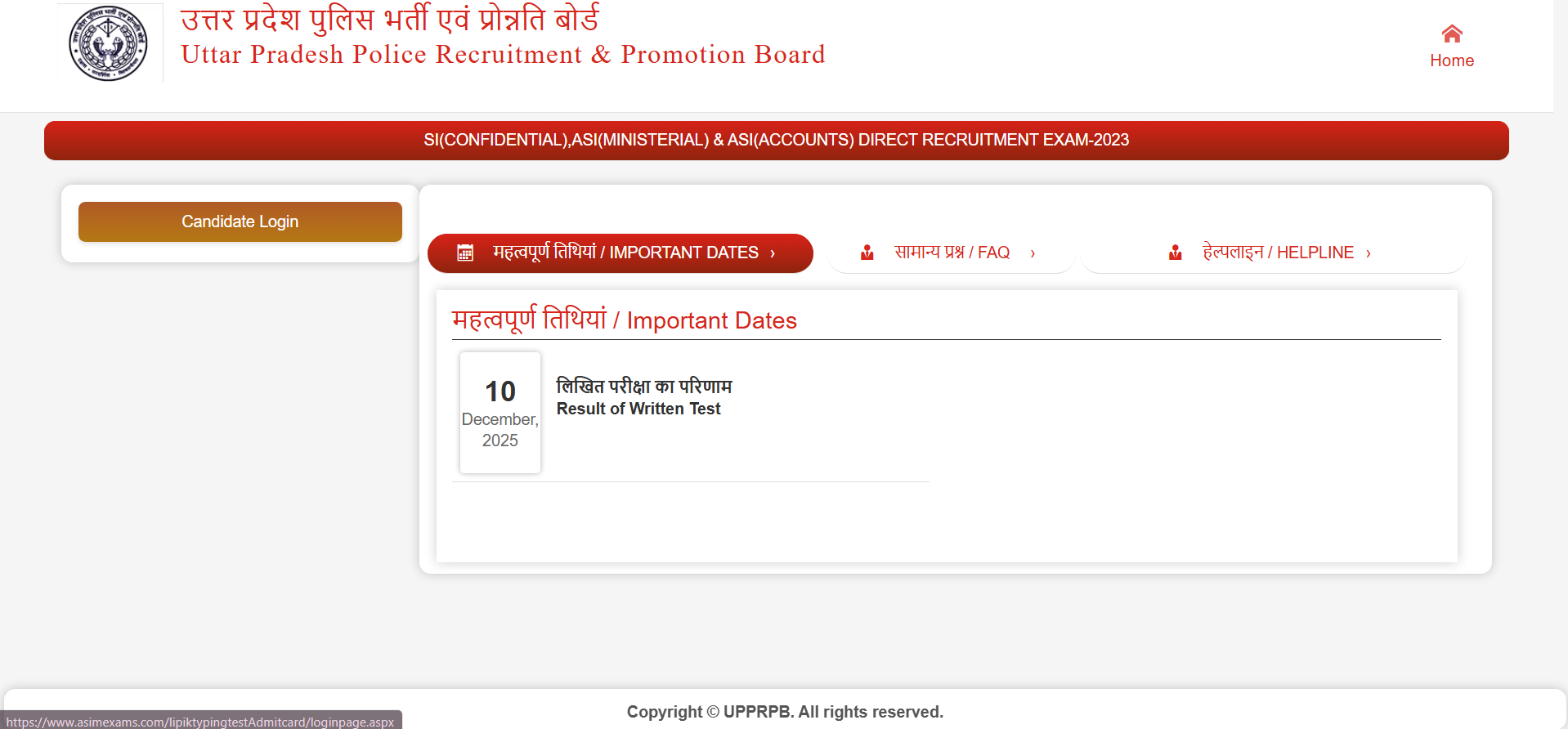 Uttar Pradesh Police Recruitment and Promotion Board (UPPRPB)UP Police SI and ASI Typing Test Admit Card 2026 |