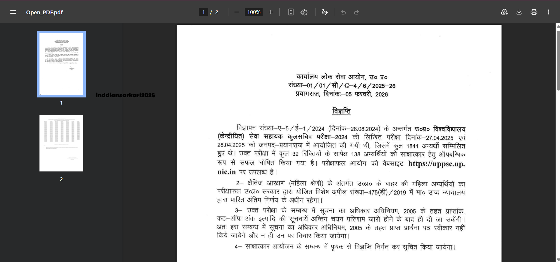 Short Information : UPPSC Assistant Registrar Result 2026 The Uttar Pradesh Public Service Commission (UPPSC) has released the results of the Assistant Registrar Examination 2025 on its official website. The examination was held from April 27 to 28, 2025, and the last date for submitting application forms was September 28, 2024. Candidates can check their results by logging in to the portal using their enrollment number, registration number, or date of birth. The official update from IndianSarkari2026 and the direct link are provided below.