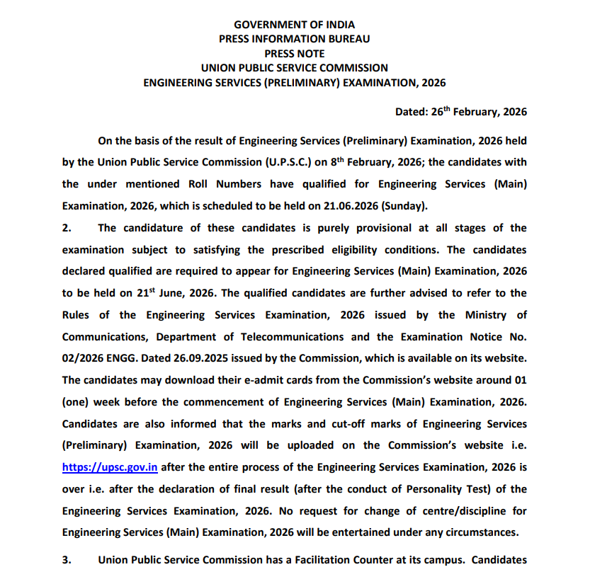 Union Public Service Commission (UPSC)UPSC Engineering Services Pre Result 2026 |